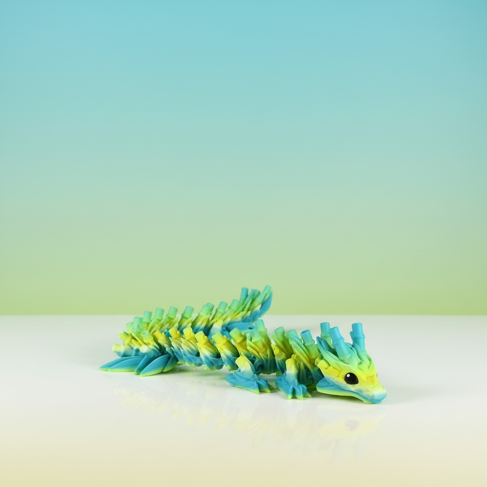 Die fließende Silhouette des Celestial Dragons wird durch seine voll artikulierte Struktur zum Leben erweckt. Er gleitet geschmeidig durch die Hände und lässt sich in beeindruckenden, dynamischen Posen präsentieren. Ob er sich majestätisch aufbäumt oder elegant in sanften Kurven auf deinem Schreibtisch ruht – seine Präsenz ist stets von einer erhabenen Ruhe geprägt.
